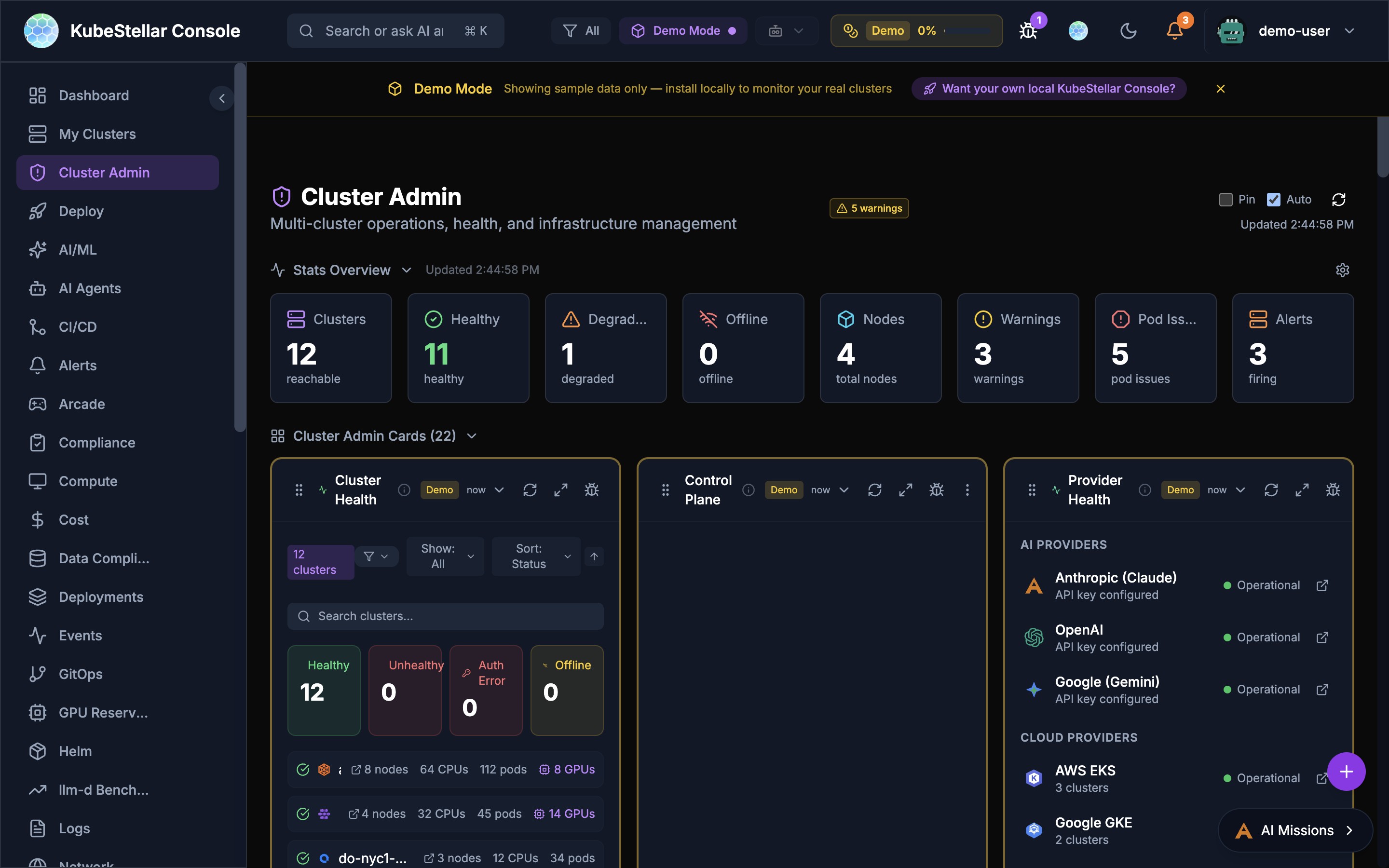 # Card What it shows 51 AI Issues Issues detected by AI 52 Kubeconfig Audit Audit of your kubeconfig 53 AI Health Check AI health check gauge
