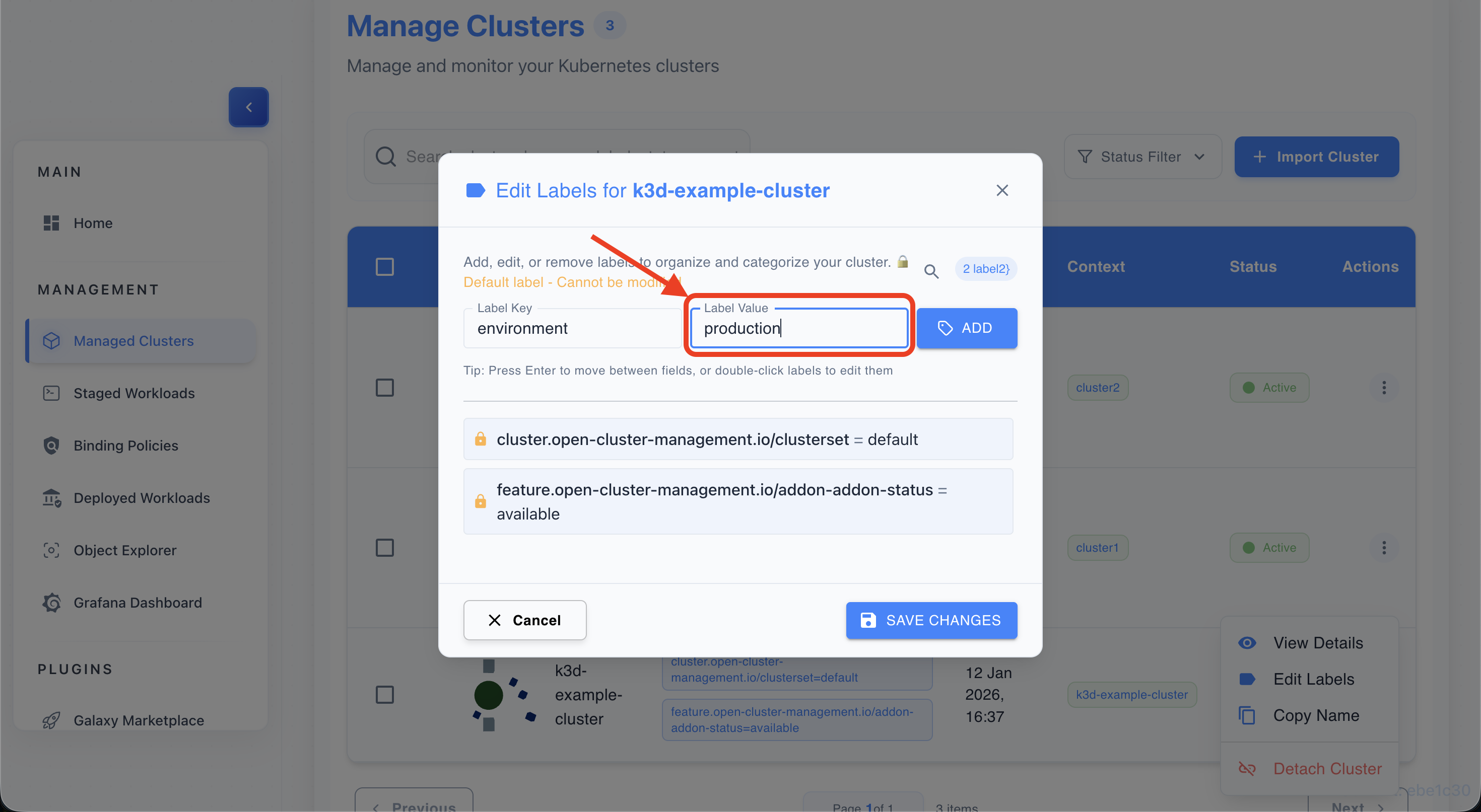 - Architecture: ITS aggregates cluster metadata, status, and labels from the KubeStellar backend. It presents search, filters, and actions to manage clusters and labels.