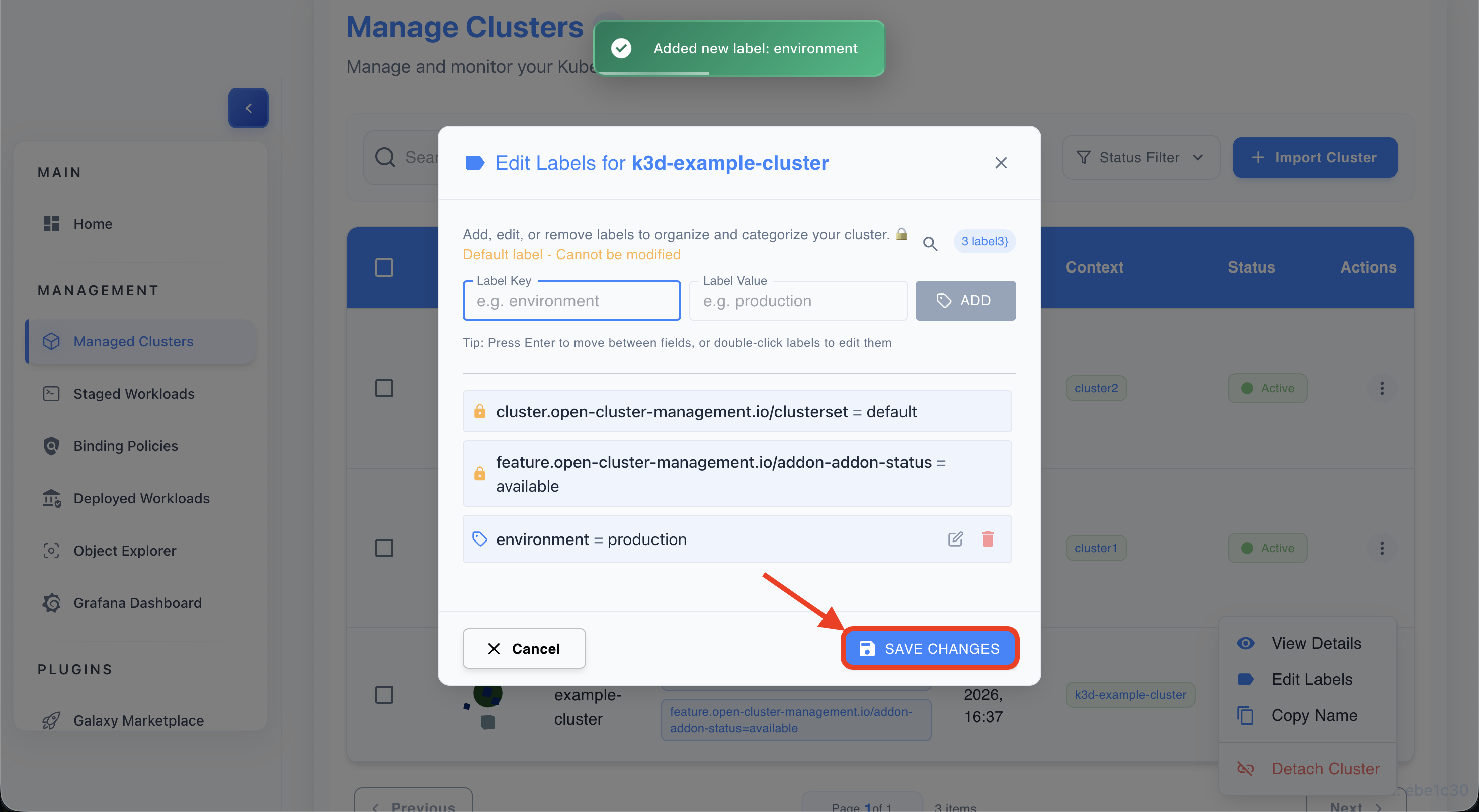 - Cluster lifecycle: Discover → Import → Label → Monitor → Detach. ITS keeps status in sync and exposes per-cluster detail dialogs and logs.